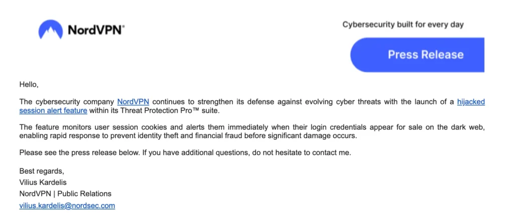 NordVPN’s hijacked session alert feature is designed to ensure that users get notified when their authentication cookies are compromised and are being sold on dark websites. The feature is part of the larger scheme by Nord to enhance the security of its users.