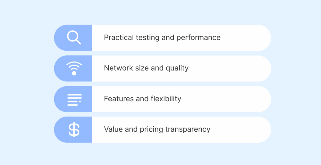 - IP authenticity: Providers that offer residential IPs, which resemble real user traffic, are always more valuable than those using easily detected data-center IPs.