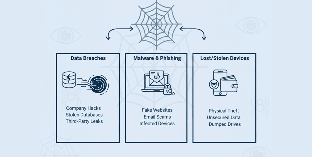 - Compromised credentials: The most common find. Hackers aggregate billions of username/email and password combinations from thousands of past breaches into massive lists, then use bots to try the same logins on hundreds of websites in “credential stuffing” attacks.